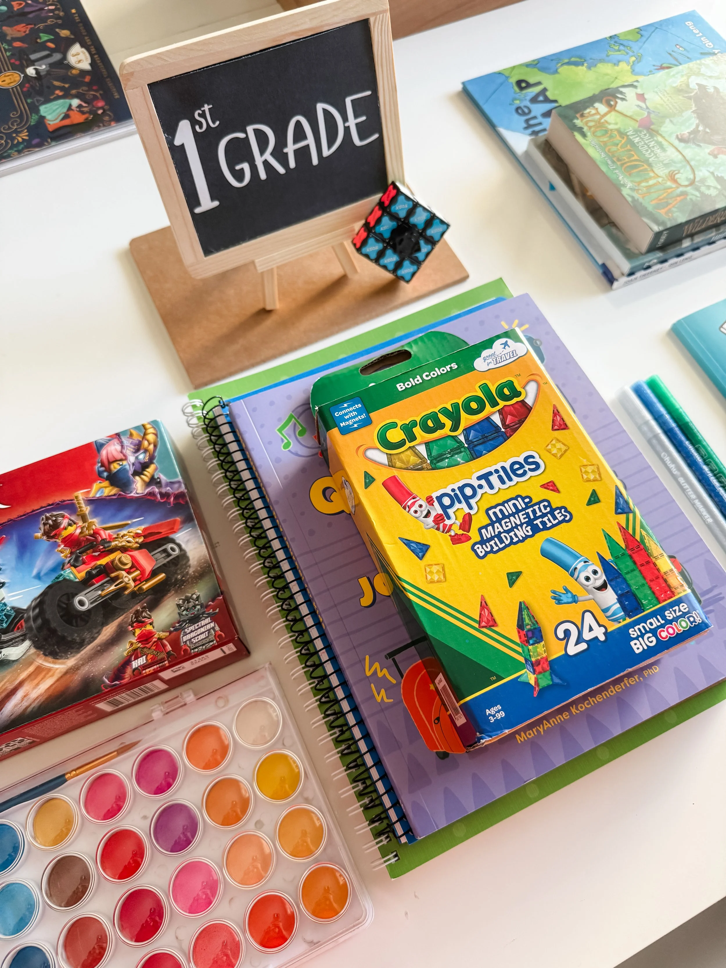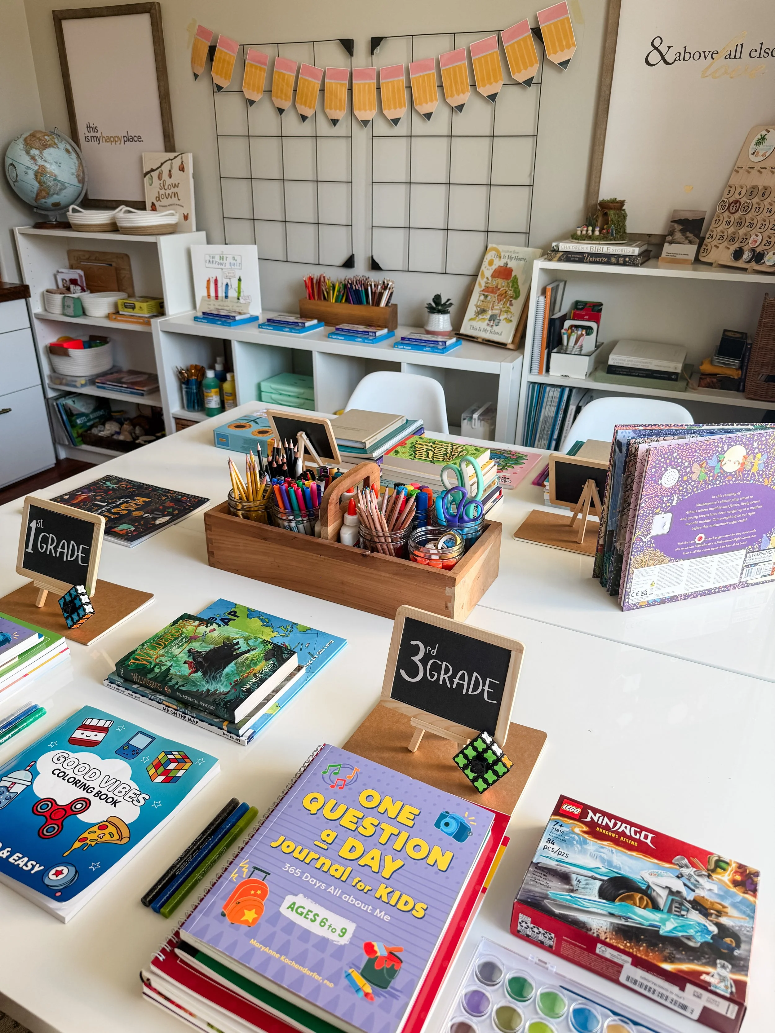 I never know exactly how our first day set up will all come together. This year I bought I few extra things for their baskets, but it definitely didn’t all fit. So, instead, I pivoted a bit and just strewed some of their new books and supplies into our school room and I think it worked out really well and turned out cute.