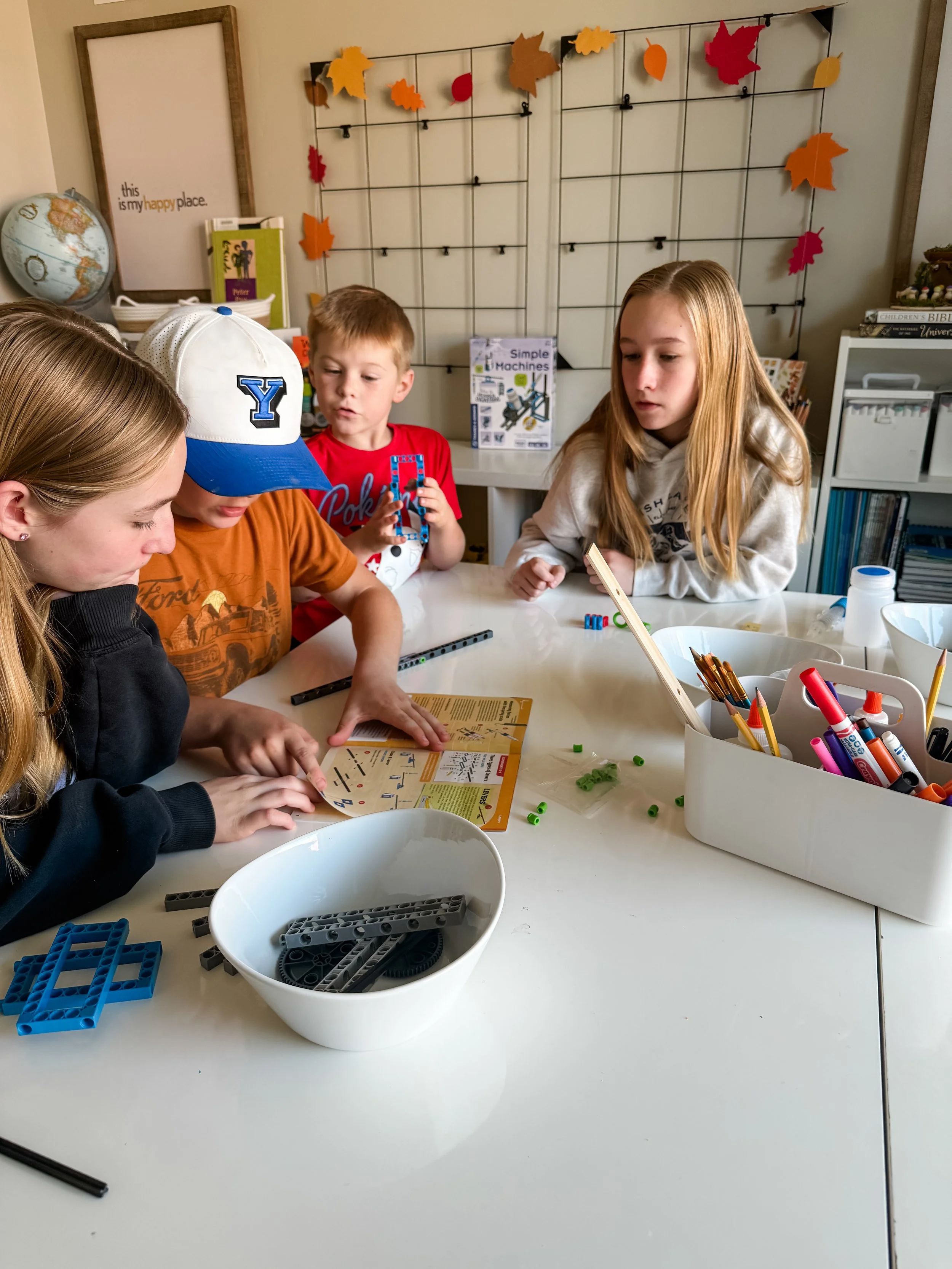 For our family studies we usually study either art, science, or history. This particular Tuesday we spent about 15 minutes in scripture study and then we worked on our engineering unit. I led a lesson for about 30 minutes (which included watching a few video clips) and then the kids did some science experiments our of this Simple Machines kit.